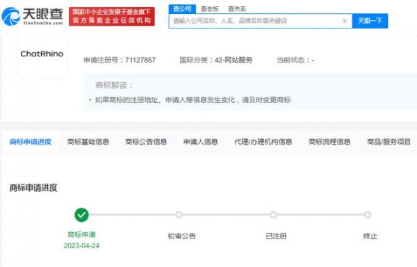 5月5日消息,天眼查App显示,近日,北京京东叁佰陆拾度电子商务有限公司申请注册“ChatRhino”商标,国际分类为网站服务,当前商标进度为申请中。(一橙)