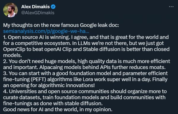 这篇文章在推特等社交平台上得到了大量转发。其中,得克萨斯大学奥斯汀分校教授 Alex Dimakis 发表了如下观点: