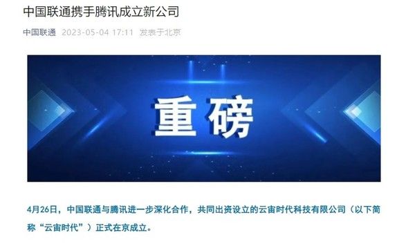 【CNMO新闻】CNMO注意到,近日,中国联通公众号发文宣布,将与腾讯进一步深化合作,共同出资成立云宙时代科技有限公司,于4月26日正式在北京成立。