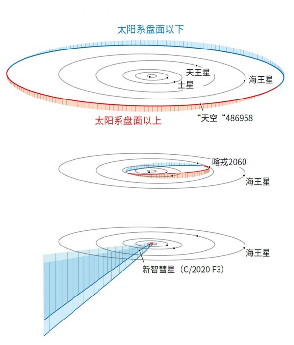 路口。许多柯伊伯带天体如“天空”(上),像喀戎(中)等半人马型小行星一样,沿着相对于行星轨道的倾斜度最小的轨道运动。但是奥尔特云彗星,比如C/2020 F3(下),经常以大角度的高度拉长的椭圆轨道快速通过。