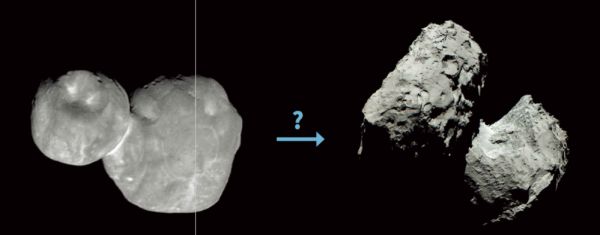 彗星的形成 经过多年的观察和计算,天文学家推断类似“天空”的柯伊伯带原始天体(左)变成了木星家族彗星67P/ 丘留莫夫-格拉西缅科彗星(右)。问题是,处于过渡期的天体是什么样子的?