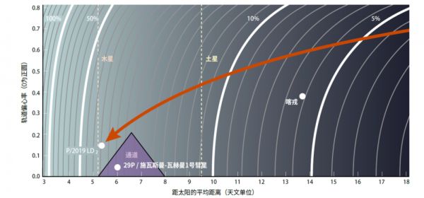 彗星走过的路。随着时间的推移,半人马型小行星可以从外太阳系迁移到木星附近,当它们朝向太阳行进时,会接收更强烈的阳光(这里显示为较浅的阴影)。它们的轨道逐渐变圆(y轴)。箭头指示的是阿特拉斯(P / 2019 LD2)在过去的几千年里可能经过的路线,白色圆点标记的是半人马型小行星喀戎和施瓦斯曼-瓦赫曼1号彗星当前所处的轨道,后者正是沿着位于所谓“通道”(紫色三角形)的轨道绕转,因而正在通往成为一颗木族彗星的路上。白色等高线表示太阳在特定轨道上的热量与木族彗星所接收热量的相对比例。