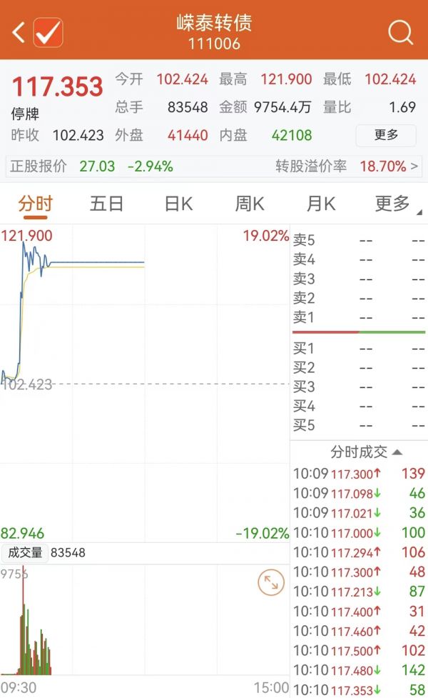 转债市场今日出现“大乌龙”。原本公告停牌的嵘泰转债(111006),今日早盘却仍能正常交易,盘中一度上涨近15%,成交额接近1亿元。