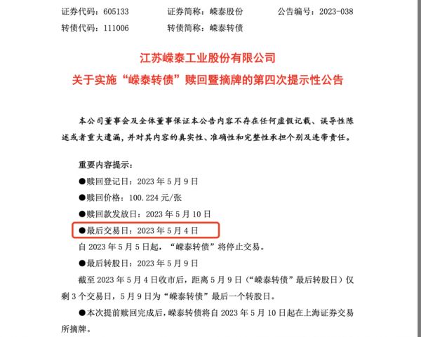截至2023年5月4日收市后,距离5月9日(“嵘泰转债”最后转股日)仅剩3个交易日,5月9日为“嵘泰转债”最后一个转股日。本次提前赎回完成后,嵘泰转债将自2023年5月10日起在上海证券交易所摘牌。