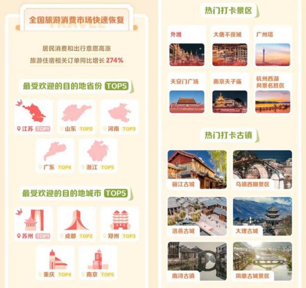 在出行的选择上,外滩、大唐不夜城、广州塔等景区景点是消费者打卡首选,游古镇、逛夜市也备受青睐,丽江古城、乌镇、洛邑古城等古镇成为热门打卡选择。