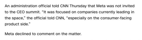扎克伯格并没有受邀参与这次 CEO 会面。据 CNN 从政府官员处获取的信息,“这次会议的焦点是目前在这个领域处于领先的公司,尤其是已有消费者产品的企业。”