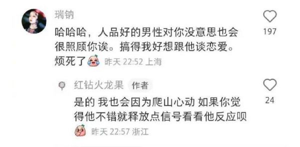 心动不如行动,行动了却也未必心动。爬山过程中虽然男生的表现很丝滑贴心,但只是因为这个男生单纯得很有教养。这次的爬山,不但没让女生感受到爱情的火花,反而更进一步加深了两人之间的拘谨。完美的爬山典范,对她来说更多的是体现了男生优质的家庭教育,而并非对她有意思。