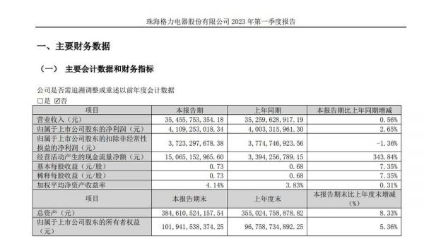 财报显示,格力电器2023年第一季度营收约354.56亿元,同比增加0.56%;归属于上市公司股东的净利润约41.09亿元,同比增加2.65%。