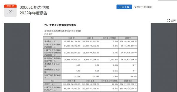 另据财报显示,格力电器2022年实现营业总收入1901.51亿元,同比增长0.26%;归属于上市公司股东的净利润245.07亿元,同比增长6.26%;扣除非经常性损益的净利润为239.86亿元,同比增长9.78%。