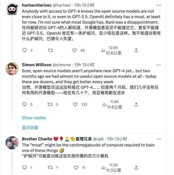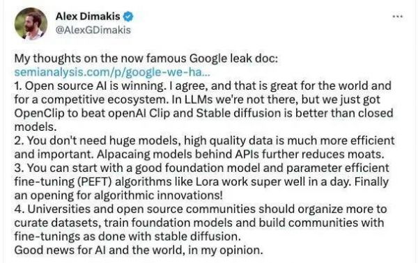 昨晚,一篇来自 Google 内部泄露的文件在 SemiAnalysis 博客传播,声称开源 AI 会击败 Google 与 OpenAI,获得最终的胜利。“我们没有护城河,OpenAI 也没有”的观点,引起了热烈讨论。