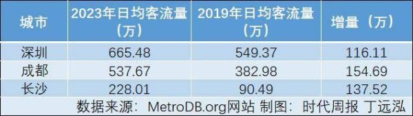 在MetroDB.org网站有完整数据记载的城市中,成都、长沙和深圳3个城市的2023年客流量一直保持在较高水平,相较于2019年的日均客流量,均有超100万的增加。