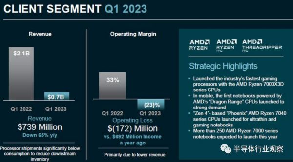 细分来看,包括台式机和笔记本PC处理器和芯片组在内,AMD的客户事业部一季度营收7.39亿美元,同比剧减65.2%;营业利润更是相比去年同期的盈利6.92亿美元,变为亏损1.72亿美元。