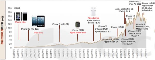 手机功能不断更新迭代,颜色、大小轮着来;围绕着手机发布了手表和耳机;基于手机拓展软件等服务生态。这些战略,让苹果利润和股价不断双击。