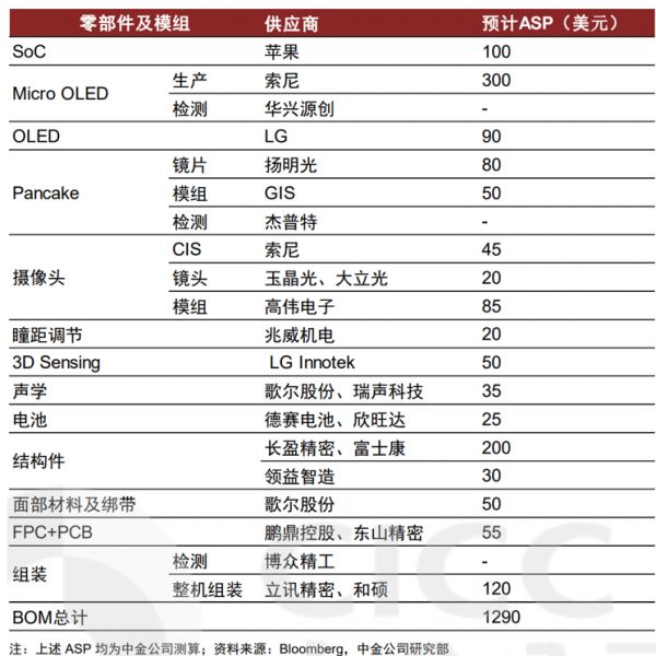 而中金证券电子彭虎团队也对苹果BOOM进行了拆分和估算,结构占比大致相同。屏幕占大头,除此之外是结构件。