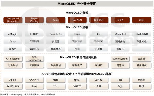 Micro OLED产业链,上游包括原材料、设备、零部件等,中游是面板制造。和半导体一样,在阵列、蒸镀环节的关键设备、原材料仍以日韩、美国厂商为主。国内公司也在积极突破。