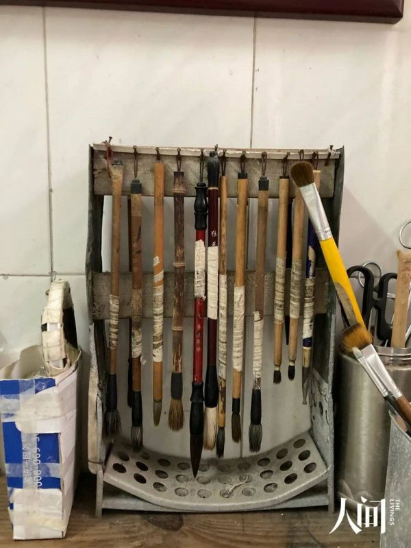 彭海提把隔壁一个空置的小房间当作他的画室,找来一张闲置的旧床,在上面放张木板,就是画台。画室里挂着很多型号、大小不同的毛笔,每支毛笔都缠了很多层白色的胶布。