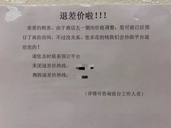 《中国企业家》走访淄博市中心多家快捷酒店发现,前台、电梯间均贴着“退差价”的告示。一家华住旗下连锁酒店前台表示,如果在第三方平台高价预订,可以联系退款,“酒店‘五一’前跟‘五一’期间的价格差不多,都是200多元,只是能不能订上的问题。”