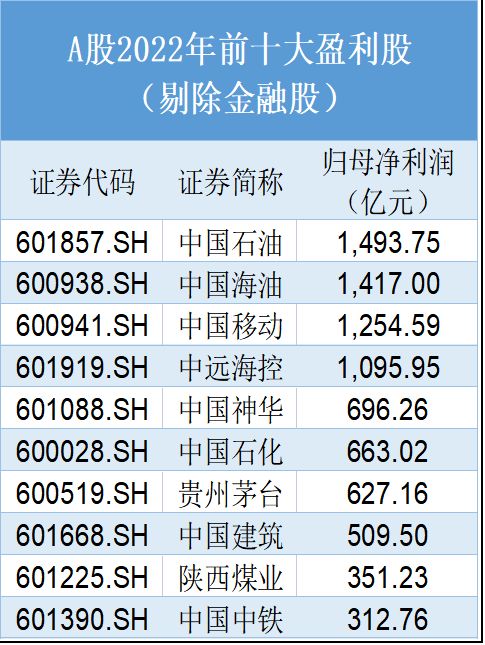 个股方面,有六家公司2022年营收超过万亿元,中国石化(600028.SH)、中国石油(601857.SH)、中国建筑(601668.SH)位列前三。盈利方面,有九家公司归母净利润超千亿元。若剔除金融股,中国石油成为A股“盈利王”,中国海油(600938.SH)、中国移动(600941.SH)、中远海控(601919.SH)、中国神华(601088.SH)归母净利润排名前五。