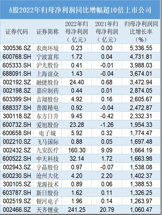 其中农尚环境(300536.SZ)净利润增速最高,同比增5337%,还有宁波富邦(600768.SH)、沪光股份(605333.SH)、上海谊众(688091.SH)、融捷股份(002192.SZ)净利增速靠前。但这些业绩增幅居前的上市公司,大多数都是因为上年基数较小。增幅超10倍的公司中,真正展现出较强盈利能力的,是九安医疗(002432.SZ)和天齐锂业(002466.SZ)。