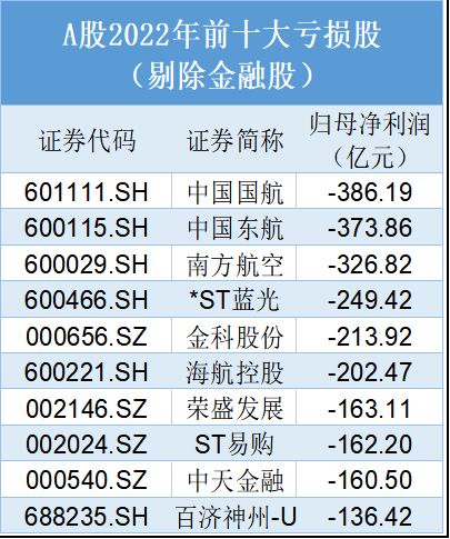 中国三大航空公司中国国航(601111.SH)、中国东航(600115.SH)、南方航空(600029.SH)亏损额排名前三,分别亏损386.2亿元、373.86亿元、326.82亿元,海航控股(600221.SH)亏损202.47亿元。