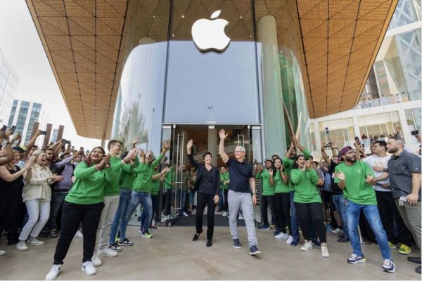 库克在印度孟买第一家苹果公司旗舰店开幕现场,图片来自苹果官方