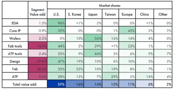 全球半导体产业链格局:美国占39%,韩国16%,中国大陆6%