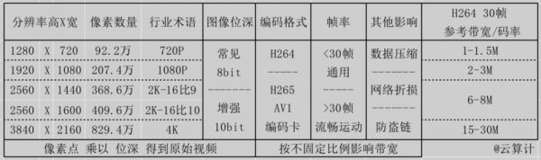 每一路视频所需的带宽,可以参考下表来推导。注意下表各要素中,除了像素数和图像位深可以直接相乘以外,其他角色都只是“强相关但不固定数值”地影响带宽,所以本文只能给出参考带宽。
