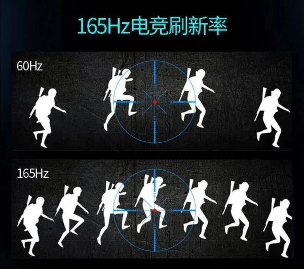 下图就是一块高刷新率电竞显示器的示意图,如果低刷新率玩射击游戏,那就真要“靠感觉蒙一枪”了。