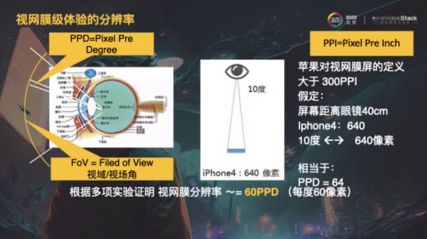 经过一系列复杂的像素和人眼视角转换,王闻宇的演讲原稿中得出了一个比较理性的结论:VR眼镜要想达到视网膜级分辨率,实现虚拟现实和生理感觉相适应,每个屏幕都要显示8k以上的分辨率的视频。