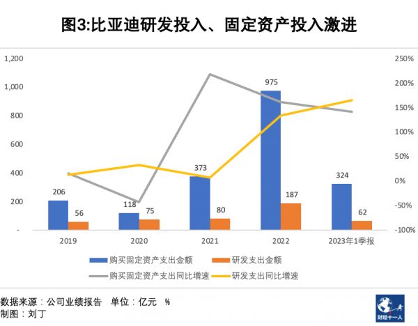 比亚迪的固定资产投资(购建固定资产、无形资产和其他长期资产支付的现金),从2019年到2021年的年均值为233亿元,2022年猛增到近1000亿元,2023年1季度的投入为323亿元,是上年同期的2.4倍。