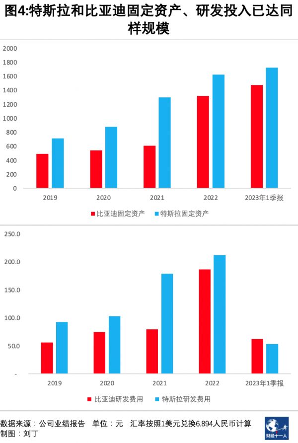 比亚迪的研发费用,从2019年到2021年的年均值为70亿元,2022年达到186.5亿元,2023年1季度为62.4亿元,是上年同期的2.6倍。2023年1季度,比亚迪的研发费用已经反超特斯拉,固定资产总额已接近特斯拉。