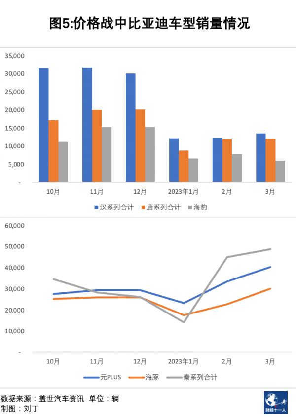 但比亚迪在20万元以下的市场依旧强势,2023年1季度,元PLUS月销从2.8万辆爬升到4万辆;海豚从2.5万辆提高到3万辆;秦系列推出改款车型,将起售价降到10万元以下,月销从2.8万辆左右爬升到近5万辆。