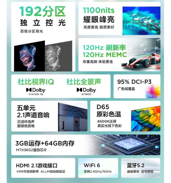 同样也是120Hz高刷屏,支持120Hz MEMC,色域达到了95% DCI-P3,原彩色温,支持杜比视界IQ,杜比全景声。