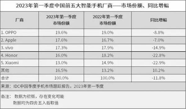 据IDC数据显示,2023年第一季度中国手机市场前五名分别为:OPPO、苹果、vivo、荣耀以及小米。