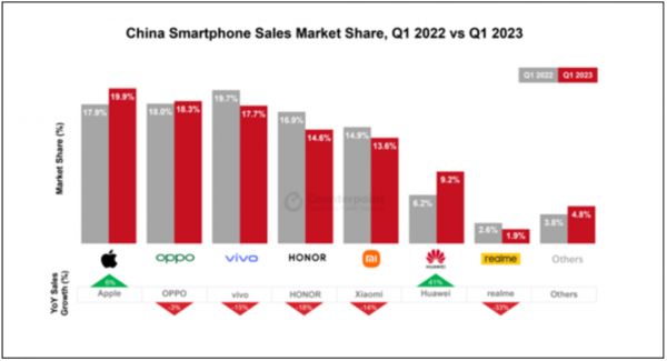 图片源自IDC中国季度手机市场跟踪报告,2023年第一季度当然,此处的OPPO市场份额中包含了一加,vivo的市场份额中包含了iQOO,小米的市场份额中包含了红米。
