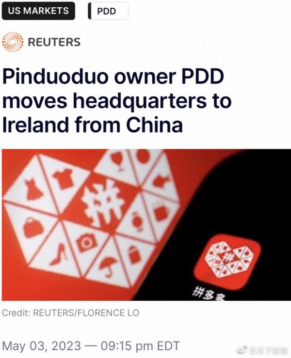 据路透社等财经媒体5月3日报道,根据提交给SEC的文件显示,中国电商巨头拼多多已经把公司总部从中国上海搬迁至爱尔兰都柏林。