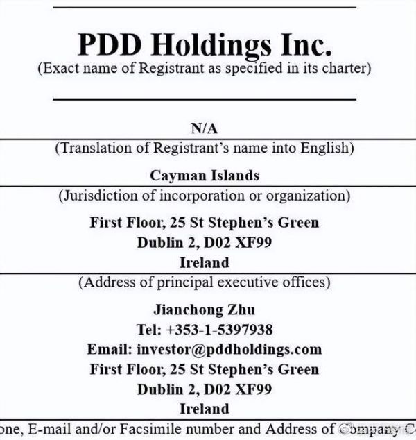 我们先来看看最近拼多多提交给美国证券交易委员会(SEC)的20-F文件。这份文件显示,拼多多将都柏林的地址列为其“主要行政办公地址”。