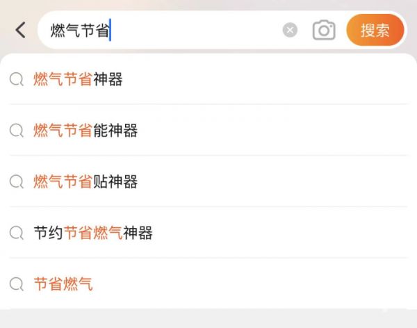 橙柿互动记者在某购物平台手机App端搜索关键词“燃气节省”,立马跳出关联词五个,分别为“燃气节省神器”、“燃气节省贴神器”等。