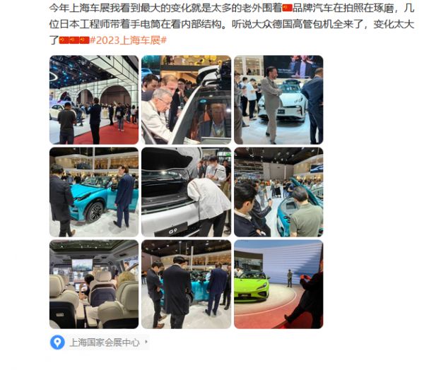 有外国车企员工参加完自家的发布会后直奔某国产品牌的展台打卡围观,有穿着讲究的日系车技术人员带上皮尺测量国产新能源车的车身数据,更有豪气的德系车企包下两架飞机,将核心工程师团队和半个董事会从欧洲直接“搬”到了车展现场。