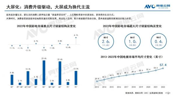 (图源:奥维云网)首先是大屏化方面,近几年国内电视市场的平均尺寸一直在增大。奥维云网数据显示,2013年平均尺寸仅为39.9英寸,2022年已经达到57.4英寸。以前买电视主流选择可能是32/43吋,55英寸就已经是大屏了,但如今55英寸只是最低标准,更多人偏向于选择75/86这种尺寸。从销量上看,去年55吋产品的占比为23.6%,同比下滑2.9%;65吋的占比为22.6%,同比增长0.8%;85/86/98吋也分别增长2.6%、1%和0.4%,大屏已经成为一种主流趋势。