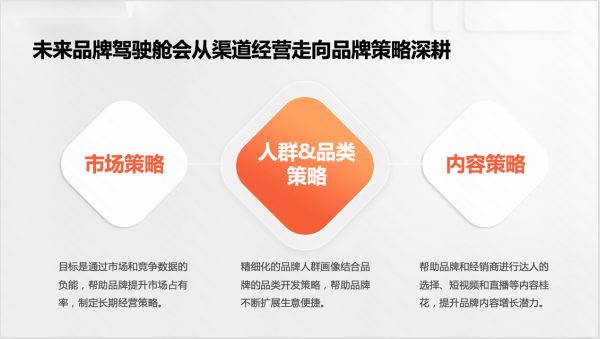未来,品牌驾驶舱将从渠道经营走向品牌策略深耕,通过优化人群&品类策略、市场策略、内容策略,推动品牌的长效发展。在人群与品类的定位上,品牌驾驶舱将为商家提供精细化的品牌人群画像,帮助品牌确定消费者群体,扩展生意边界。商家也可以通过品牌驾驶舱提供的市场与竞争数据,制定长期的经营策略,提升自身的市场占有率。品牌驾驶舱还能基于数据,帮助品牌和经销商牵线达人,进行短视频和直播策划,长期提升品牌的内容增长潜力。