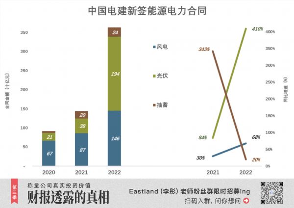 2022年,中国电建新签能源电力合同金额4529亿、同比增长88.8%。其中,风电1455亿、同比增长68.2%;光伏1937亿、同比增长410%;抽水蓄能243亿、同比增长20%。