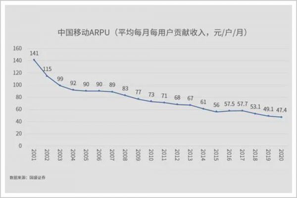 以中国移动为例,2001年其ARPU值(平均每月每用户贡献收入)为141元,到2020年下降到了47.4元,下降幅度66%。