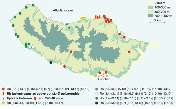 马德拉鼠的罗氏易位情况与人类似:在鼠群中以一定概率发生,少部分不影响生殖和健康的易位被保留下来,进而逐步在种群中扩散,甚至形成新的小鼠类群。在这个740平方千米的岛屿上,目前确定有六种小鼠,它们的染色体核型明显不一样。可以想见,随着采样密度增加或时间推移,大概率还会发现/出现新的小鼠种系。