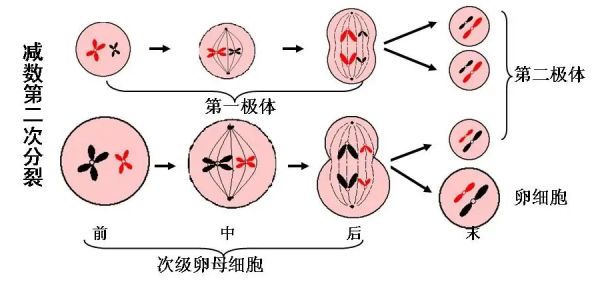 减数第二次分裂,形成1个卵细胞和3个极体;极体退化死亡。