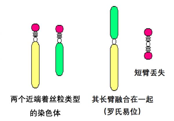 罗氏易位是指某两条染色体的长臂融合成为一条染色体,并失去短臂。在细胞分裂的中期,有些染色体的着丝粒会位于染色体的一端,其短臂极短,这一类染色体称为近端着丝粒染色体,罗氏易位往往发生在近端着丝粒类型的染色体之间。例如,人类的二号染色体,就是在数百万年之前由两条染色体发生了罗氏易位融合而成的[2]。据统计,罗氏易位在新生儿中的发生率是千分之一[3],大部分患儿会产生健康问题,如唐氏综合征和巴陶氏综合征。