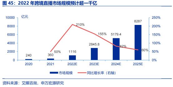 艾媒咨询发布数据显示,2022年跨境直播电商市场规模已突破1000亿元,预计2025年将达到8287亿元。