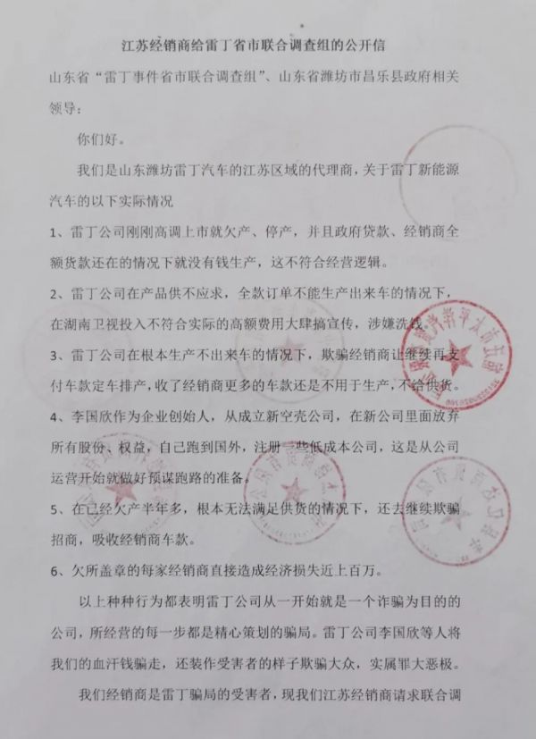 今年2月,一份由雷丁汽车经销商集体签字盖章的《江苏经销商给雷丁省市联合调查组的公开信》在网上流传,经销商们在信中质疑雷丁汽车涉嫌诈骗。