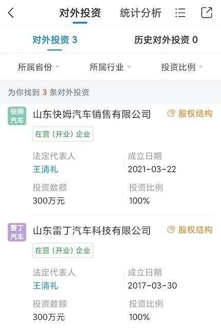 有知情人士向时代财经指出,此前,雷丁汽车将低速车售后业务外包给了一家公司——上海快姆科技有限公司。此后,上海快姆又投资了山东快姆汽车销售有限公司和山东雷丁汽车科技有限公司。值得注意的是,上述三家公司的法定代表人王清礼,曾是雷丁公司高管。公开资料显示,2018年12月份,王清礼曾以雷丁汽车副总经理兼营销公司总经理的身份参加活动。