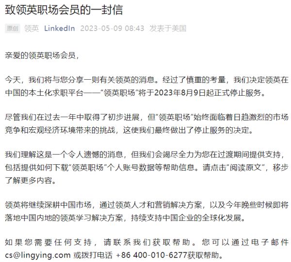 领英在中国的本土化求职平台——“领英职场”将于2023年8月9日起正式停止服务。